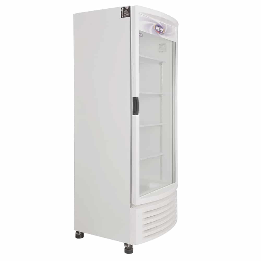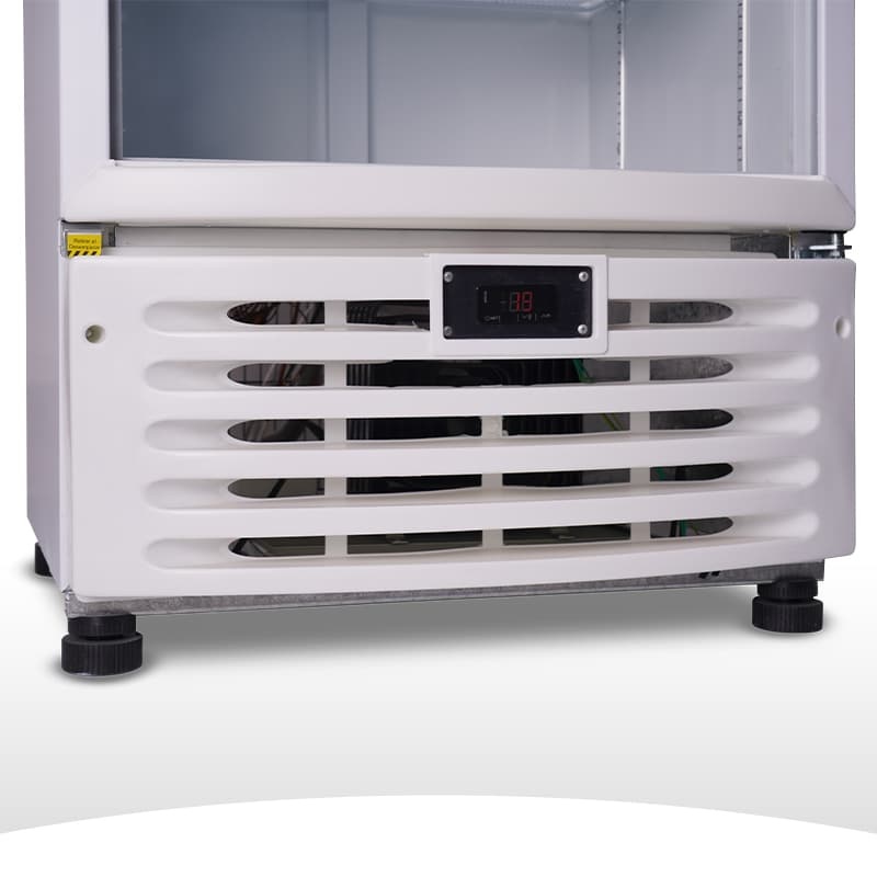Exhibidora Vertical Sin Cenefa, Condensación Forzada, Cinco Estantes Móviles, Interior en chapa pre pintada blanca, Zócalo curvo y puerta en color blanco. Gas Refrigerante R290