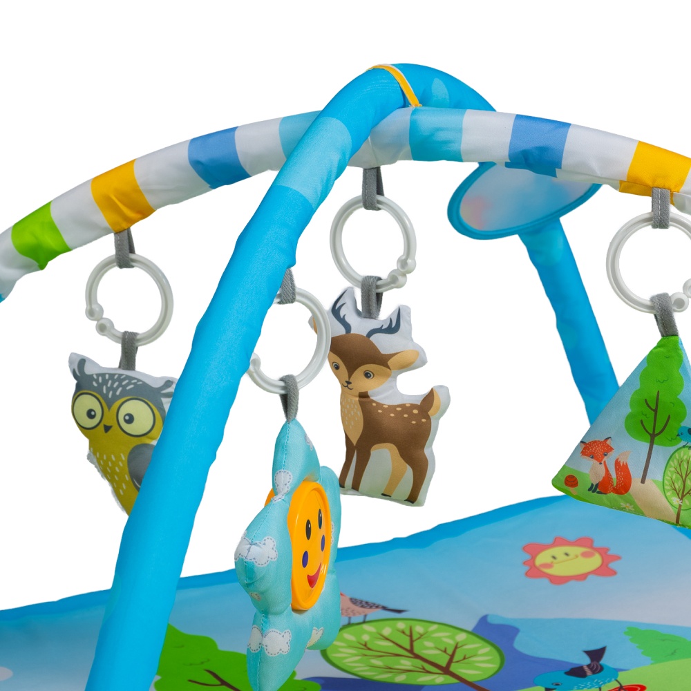 Arcos Interactivos: Equipado con arcos suaves y ajustables que sostienen juguetes colgantes coloridos, cada uno con texturas, sonidos y formas distintas para una experiencia sensorial completa.